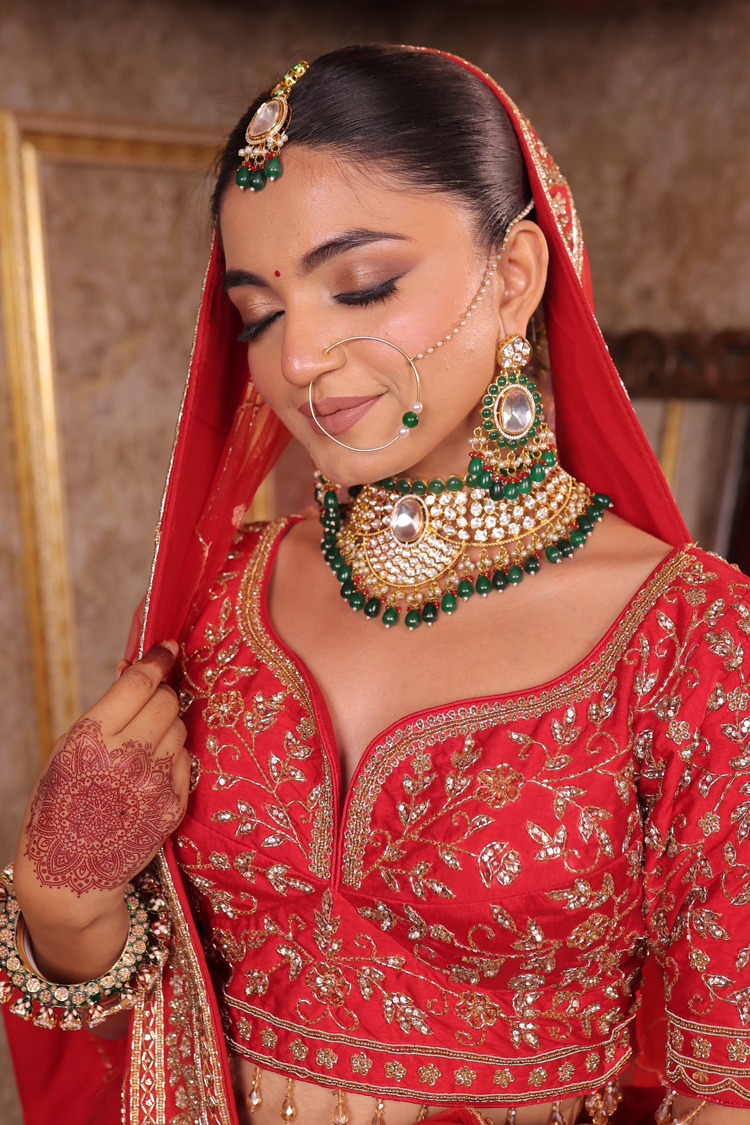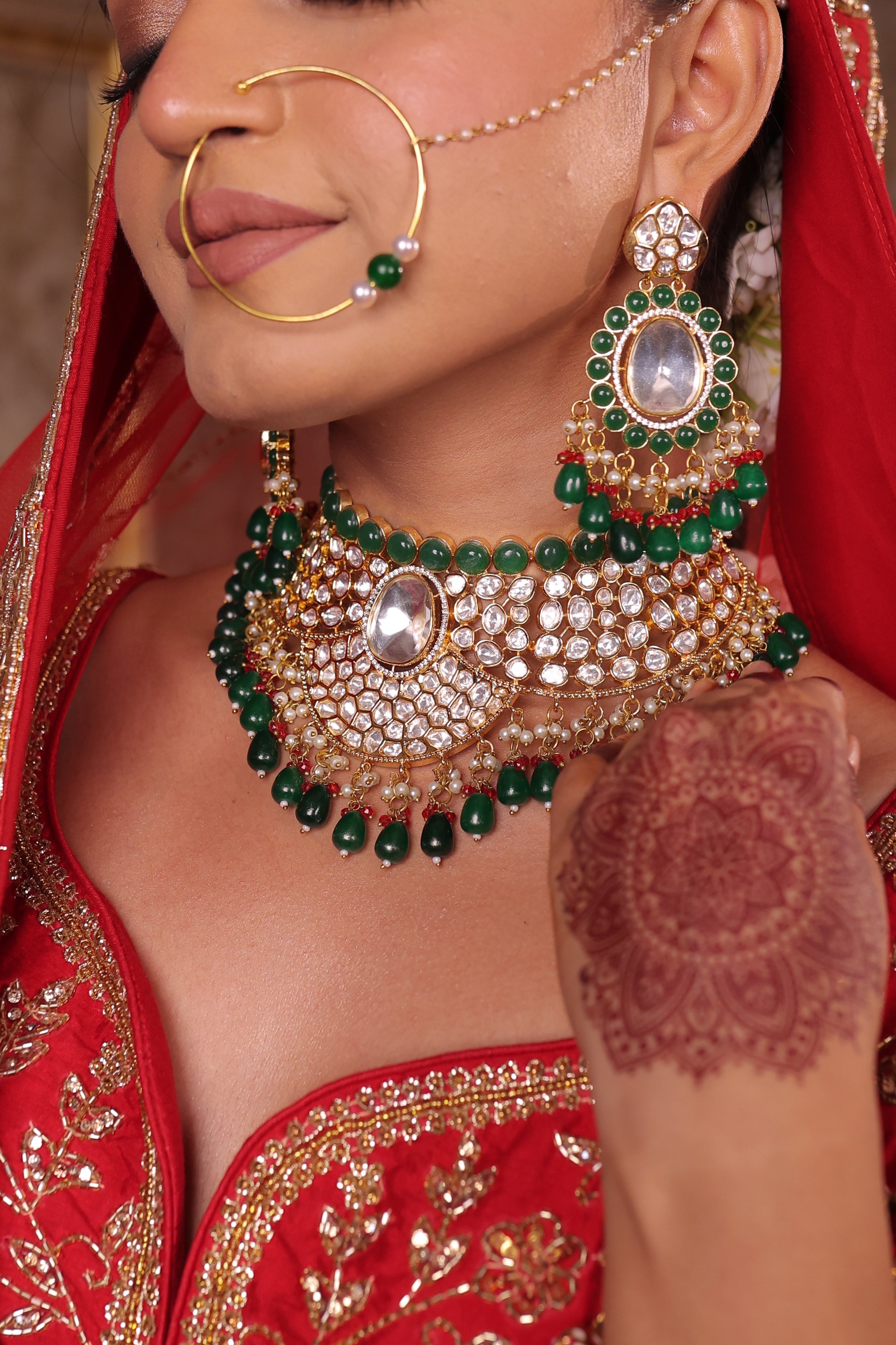 Stones Used: Moissanite Polki, glass Kundan, green beads, pearls